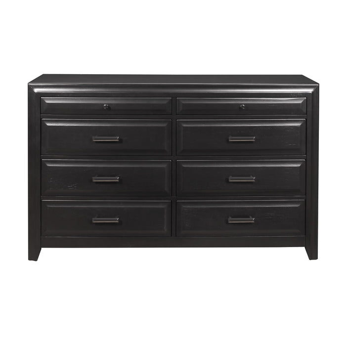 The soft modern styling of the Cordelia Collection creates a look that is a perfect fit for your bedroom. Black bar hardware play subtly against the espresso finish that graces the okume veneer of the dresser. 61 x 16.5 x 37.5H