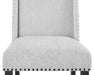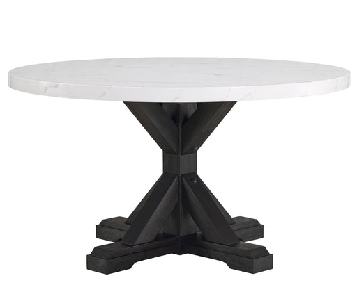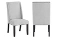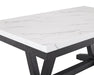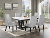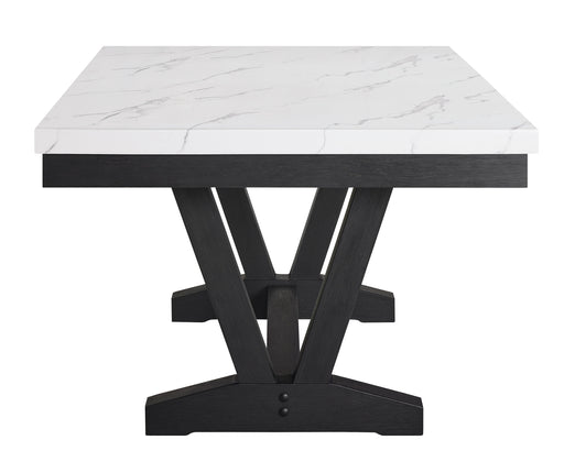 A fresh take on a traditional silhouette makes this group a great addition to your dining space. A faux marble top provides an elegant look while being easy to care for. The trestle base is updated in a contemporary charcoal finish. The upholstered dining chairs feature gently sloped wings and a nail head trim on the back.
